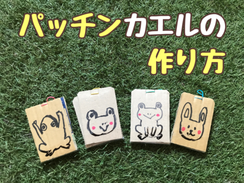 ダンボールのパッチンカエルの作り方 ダンボールの板をゴムの力で飛ばすカエルのおもちゃの作り方を紹介します。カエルパッチン、カエルペタンコ、パッチンガエル、ダンボールカエル、ゴム跳びカエル遊び。
